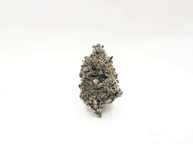 Glitter Bomb is a 70% indica-dominant hybrid strain created by crossing Grape Gas with OG Kush Breath Blueberry Headband. True to its name, Glitter Bomb dazzles with both its stunning appearance and powerful high, making it a top pick for classic indica fans. The buds are oversized and pepper-shaped, featuring dark olive green leaves, slender orange hairs, and a sparkling coat of chunky white crystal trichomes. When breaking apart these glistening nuggets, you’ll be greeted by aromas of skunky haze and ripe blueberries, with a touch of spicy herbs. The flavor leans sweet, offering a fruity blueberry profile complemented by skunky, floral haze undertones